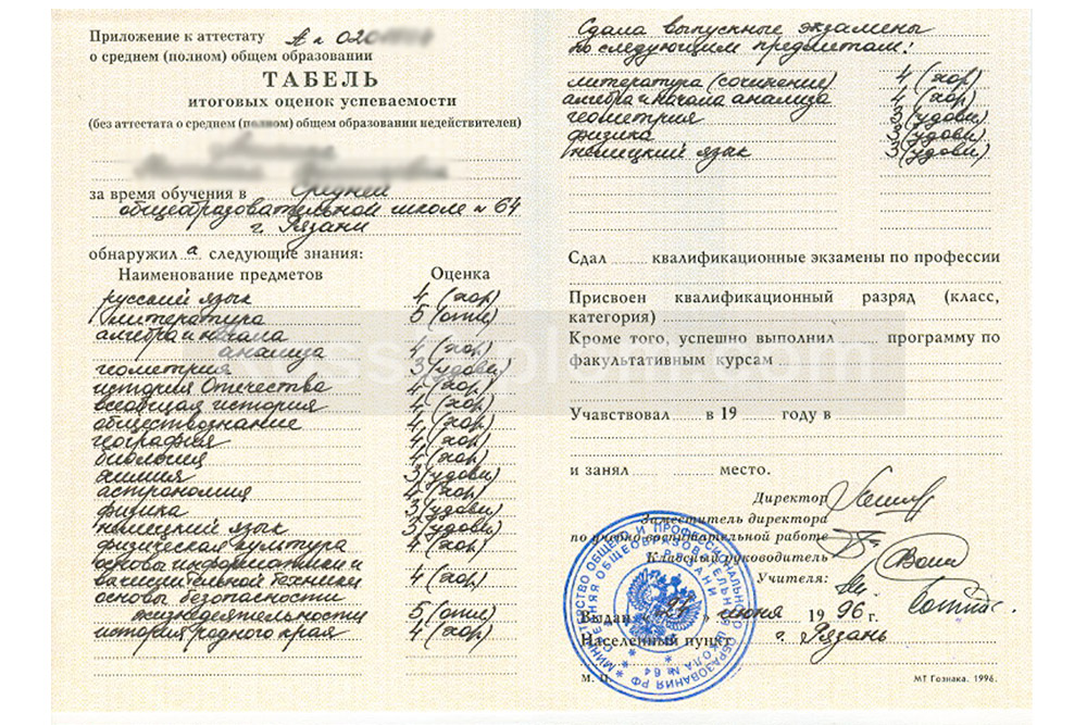 Аттестат за 11 класс свидетельствует о том, что человек проучился 10 или 11 лет в общеобразовательной школе, и без него невозможно поступить в ВУЗ, подтвердить свою успеваемость при зачислении в колледж, официально трудоустроиться на должности, где не требуется профессиональное образование. Если Вы потеряли документ, или не доучились, или не устраивают оценки, или есть еще какие-то причины, почему невозможно получить документ официальным путём, предлагаем Вам купить аттестат за 11 класс такой же, какой выдают в школах России. Мы используем только настоящие корочки «Гознак», заполняем о стандартам, заверяем актуальной печатью школы, подписью директора.